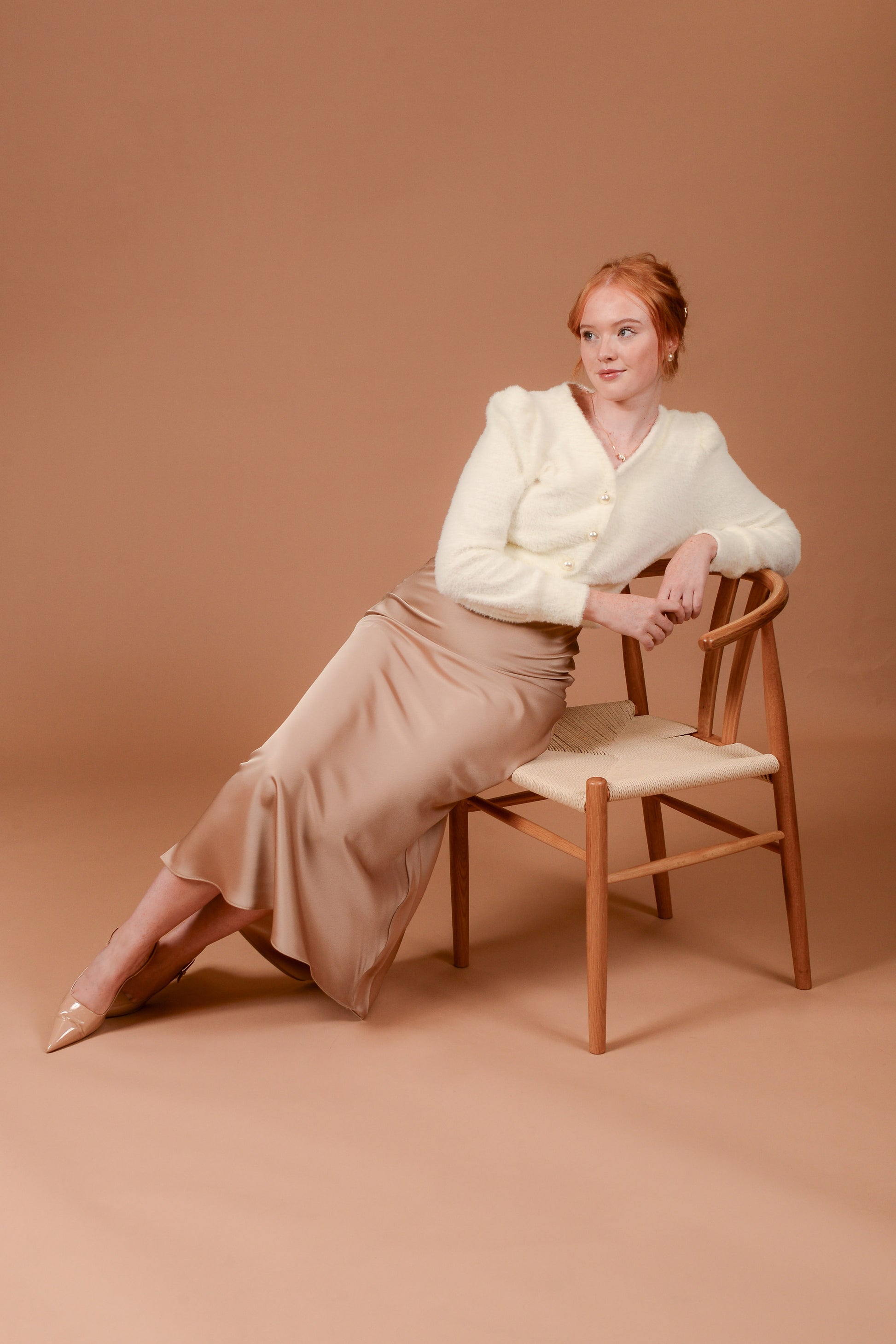 - Key Features: Bias-cut satin midi skirt, soft drape with elegant sheen, comfortable elasticated waistband at the back, versatile champagne shade.