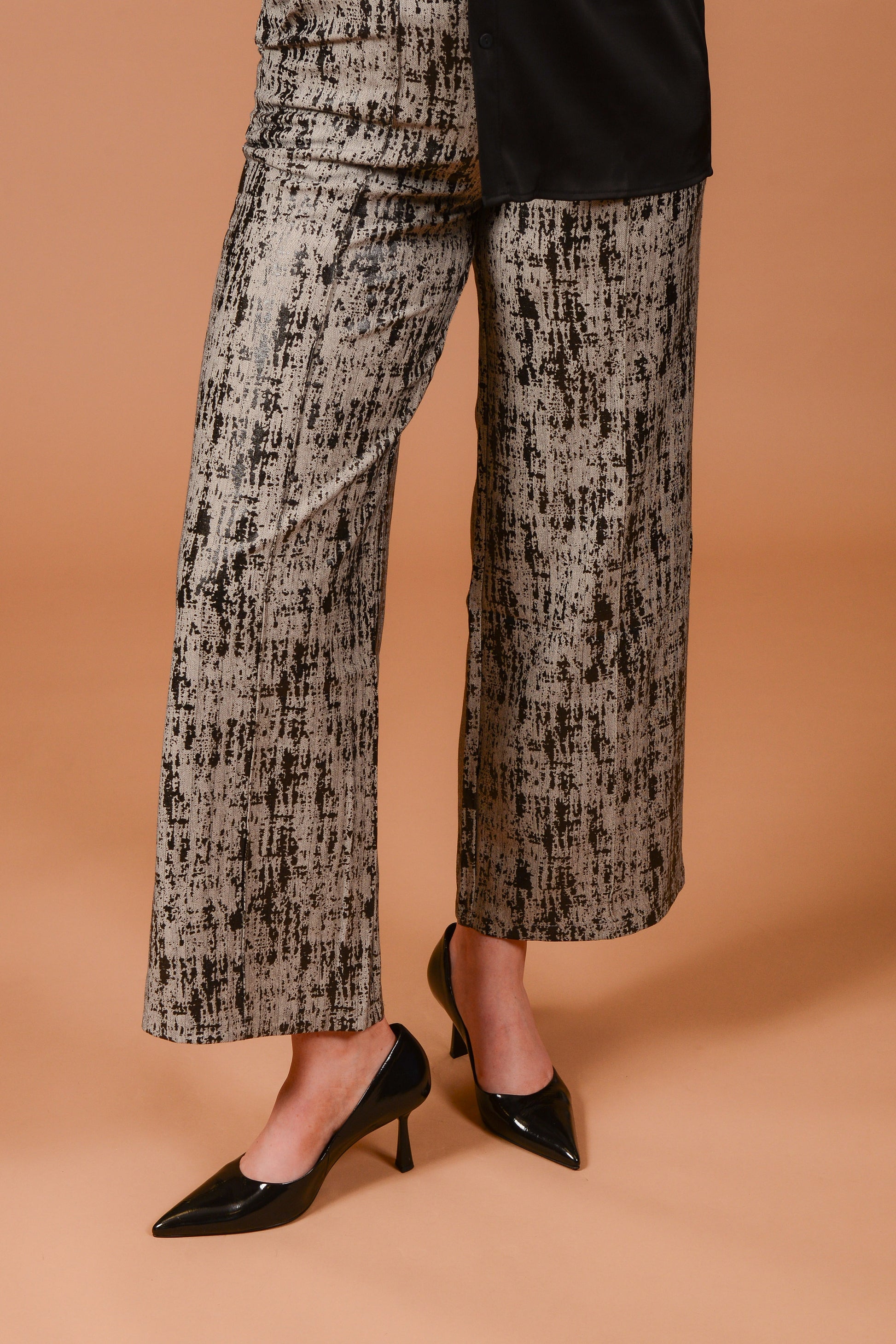 - Key Features: Straight-leg tailored fit, structured waistband, abstract monochrome print, modern yet versatile design, pockets