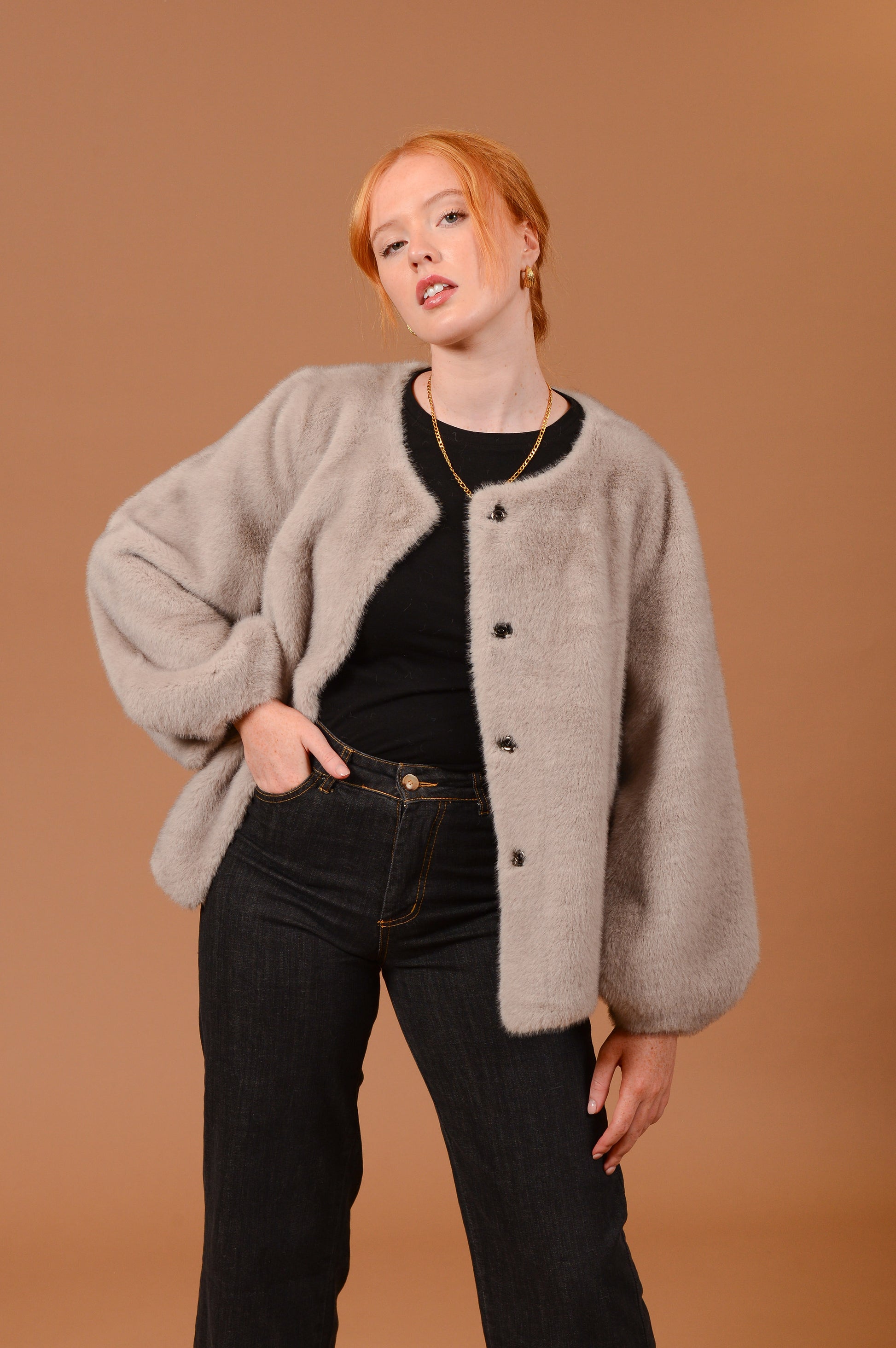 - Key Features: Round neckline with front button closure. Soft lightweight faux fur. Relaxed fit with fluid drape. Fully lined for comfort. Cocoon style sleeves.