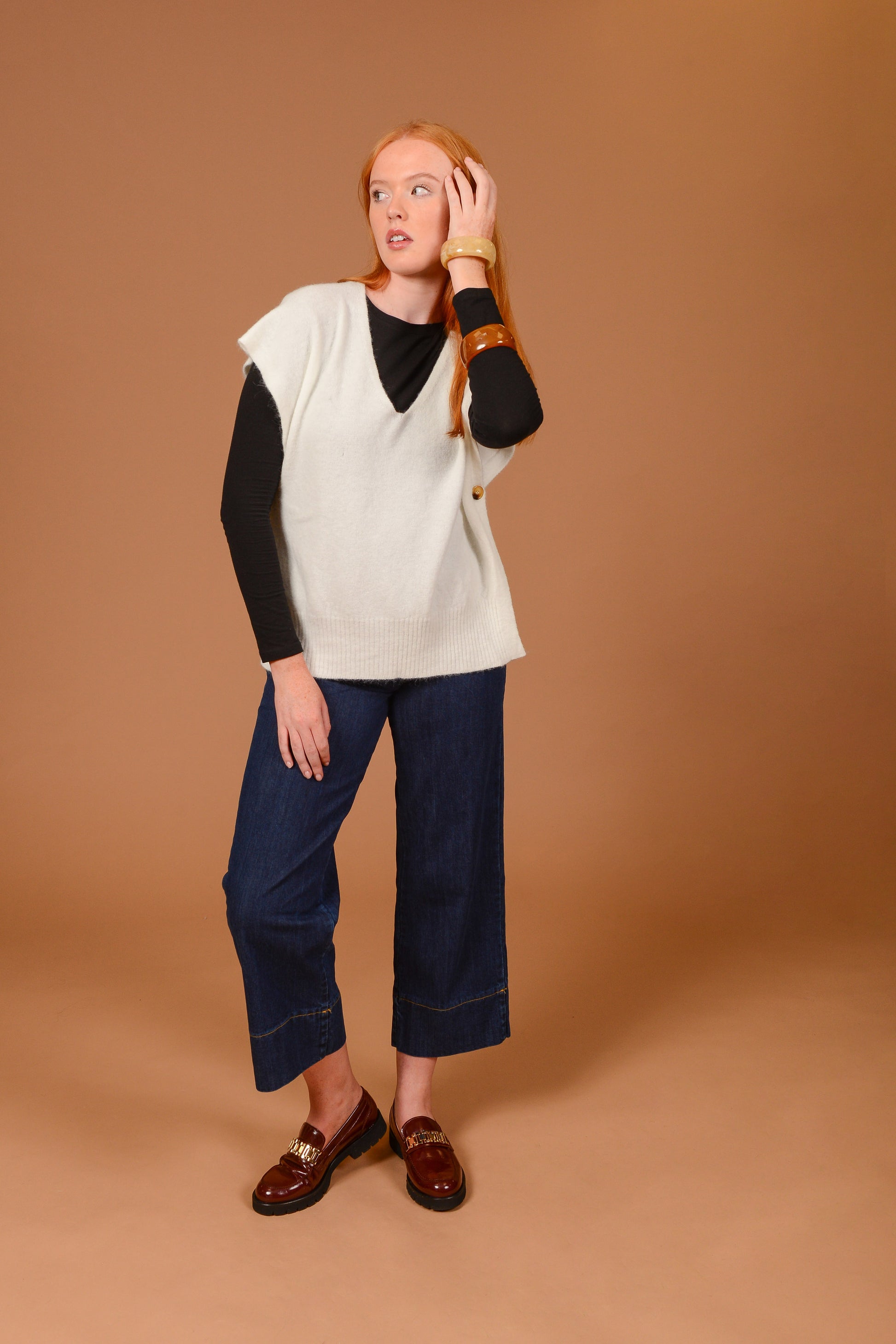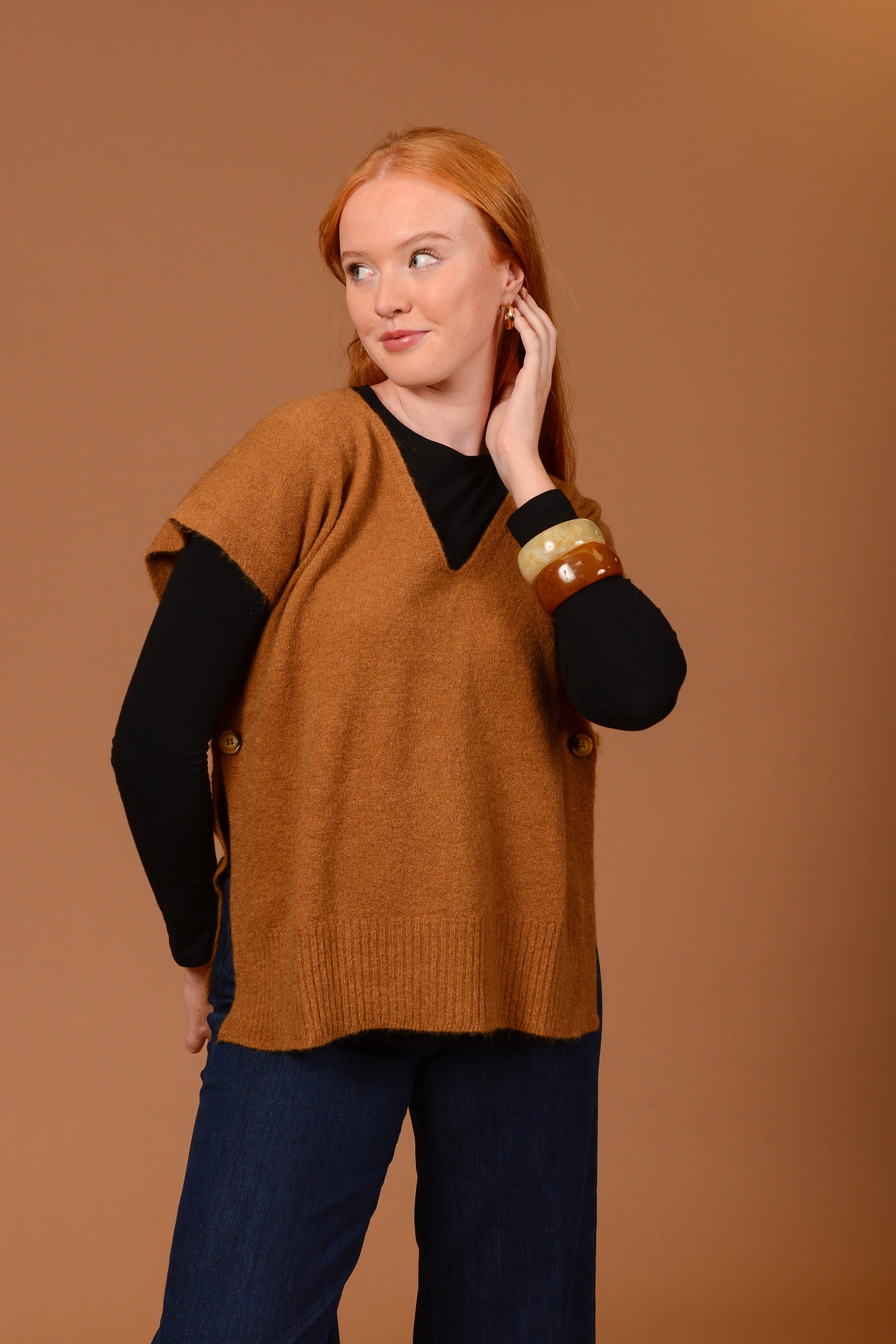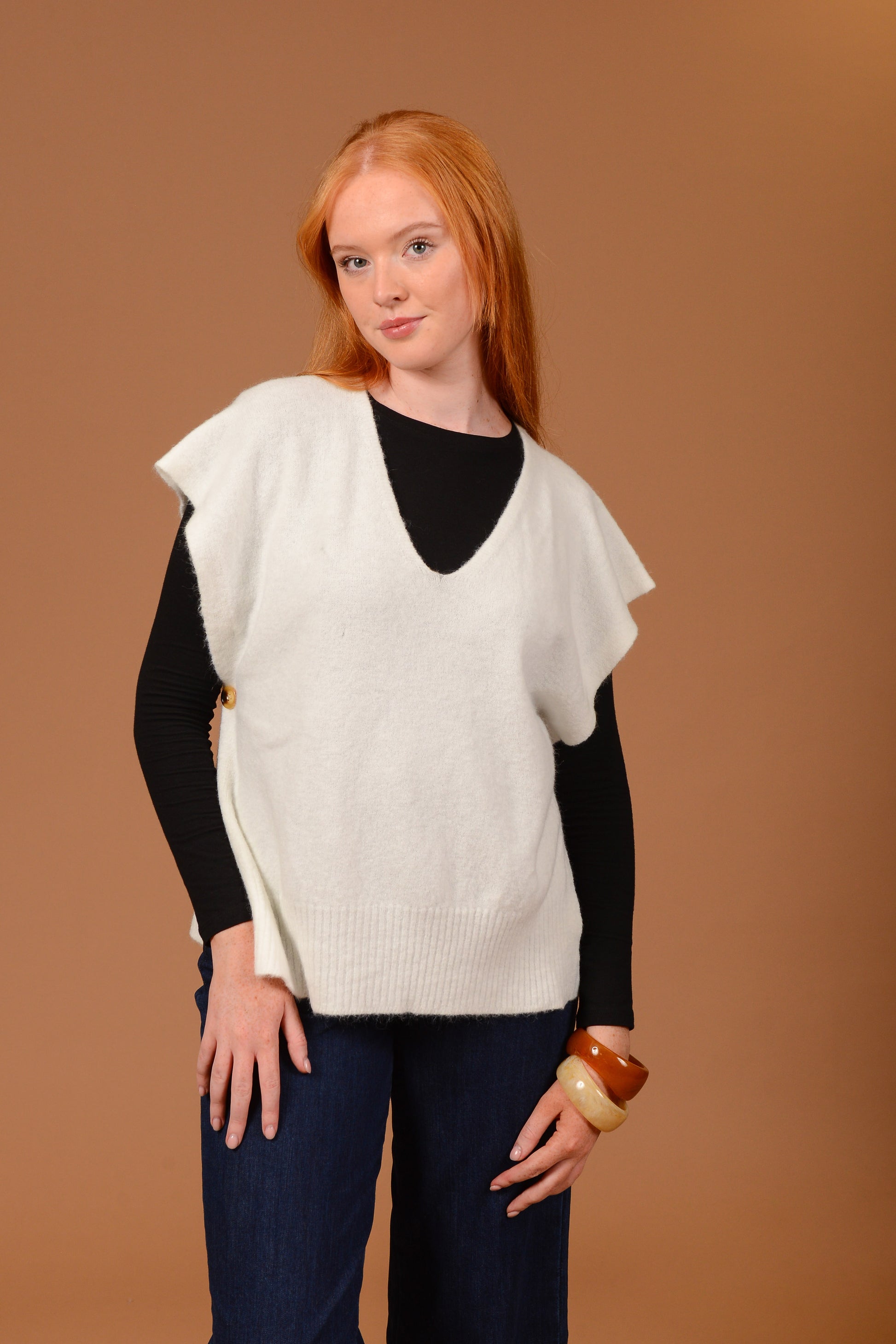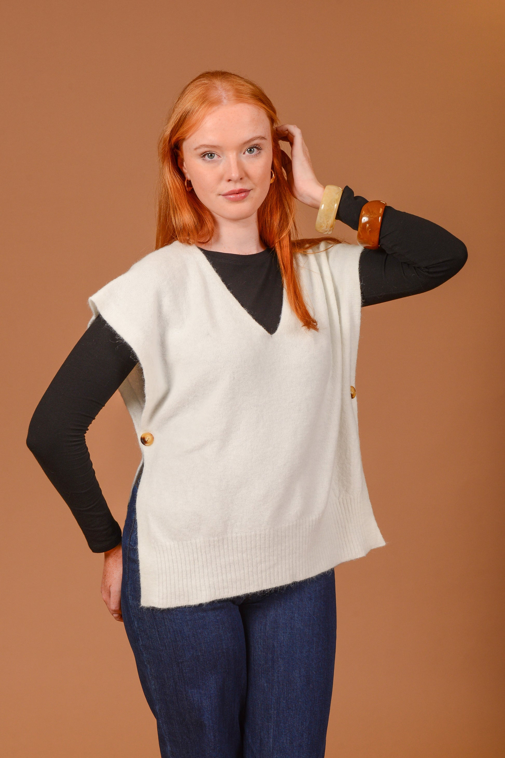 A timeless wardrobe staple, this soft knit top is crafted in a feather-light blend for a luxuriously cosy yet breathable feel. Designed with a flattering V-neckline and no sleeves, it drapes beautifully over the body for an effortless silhouette. This vest closes on either side with a button detail that adds a modern touch, making it perfect for layering or styling solo. Pair with tailored trousers for chic workwear or dress down with denim for an elevated casual look.