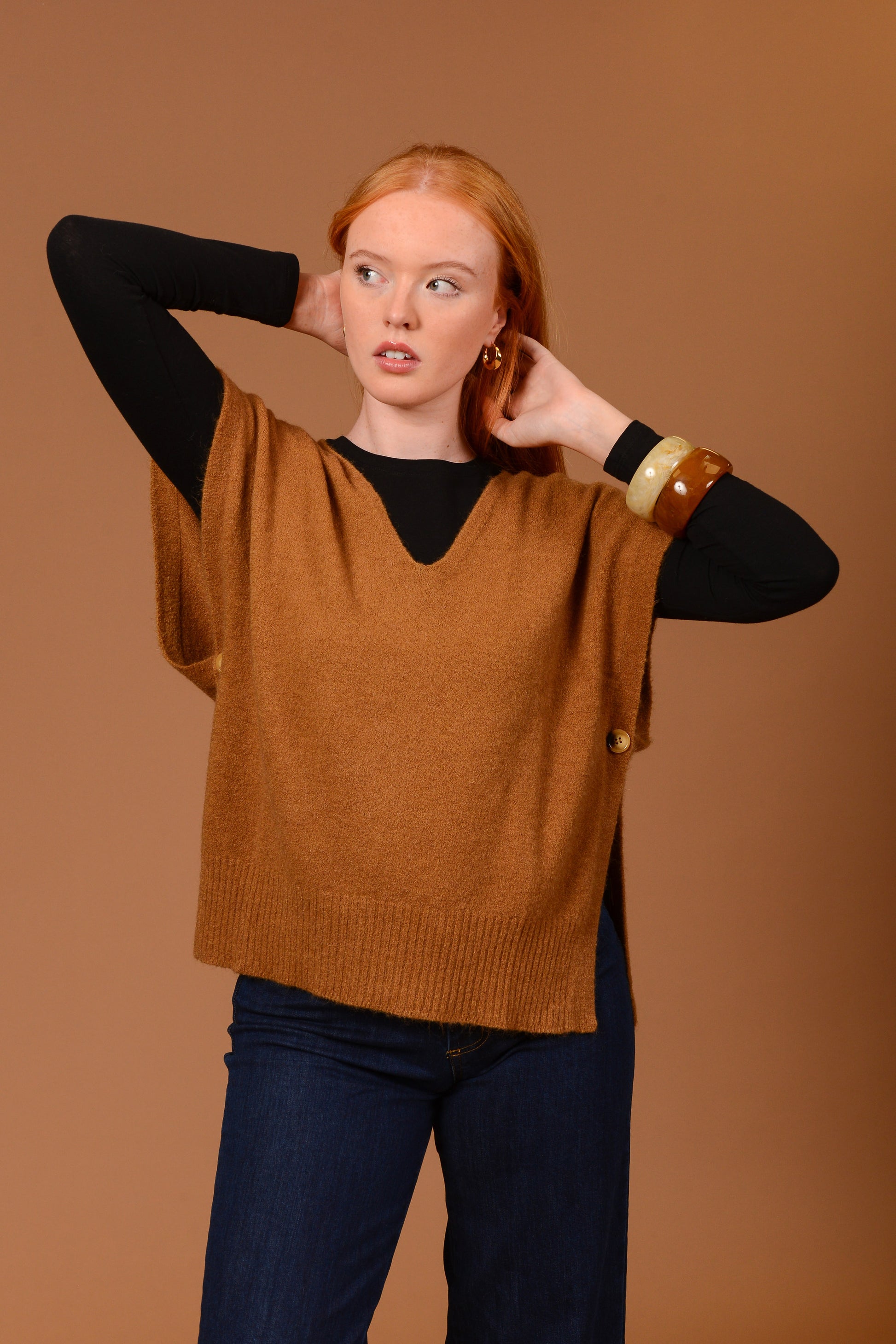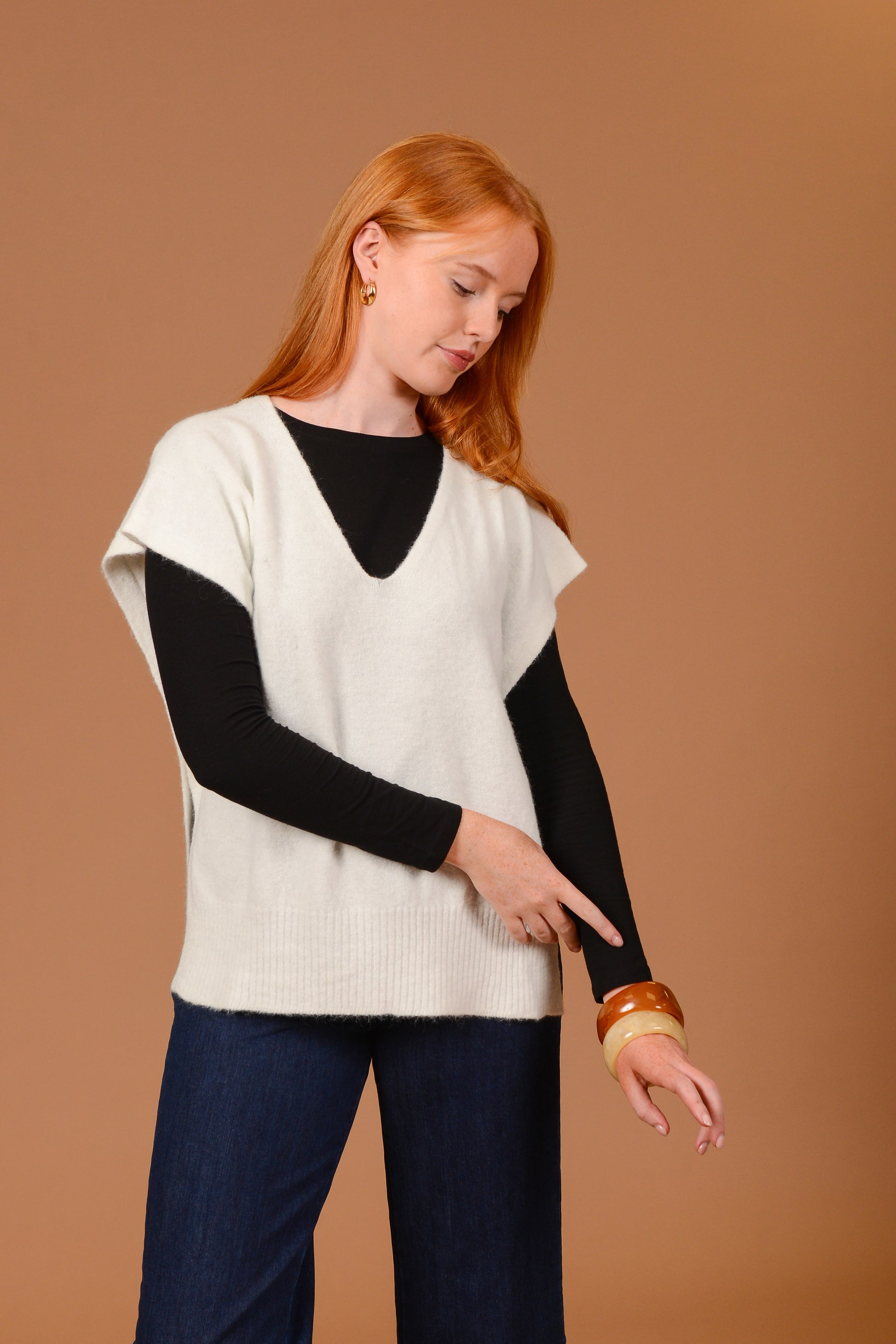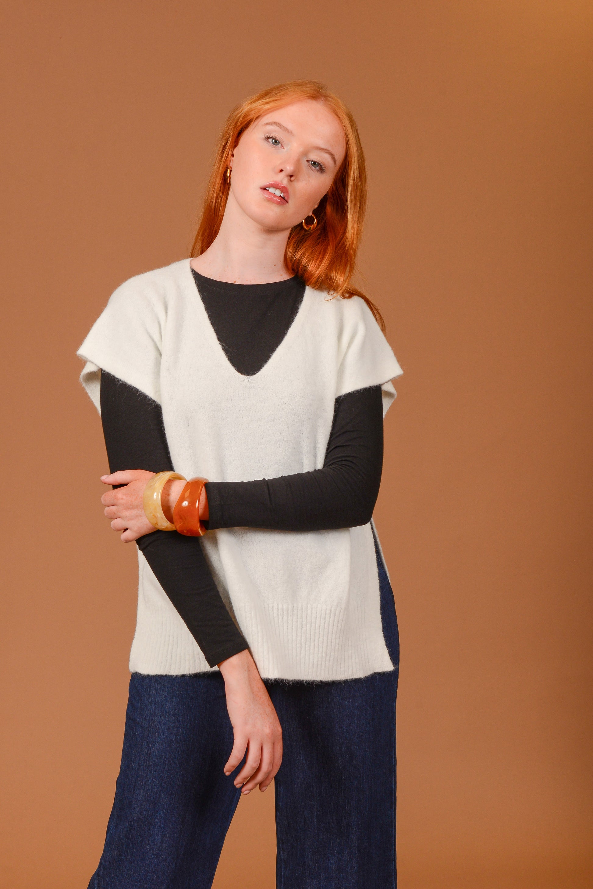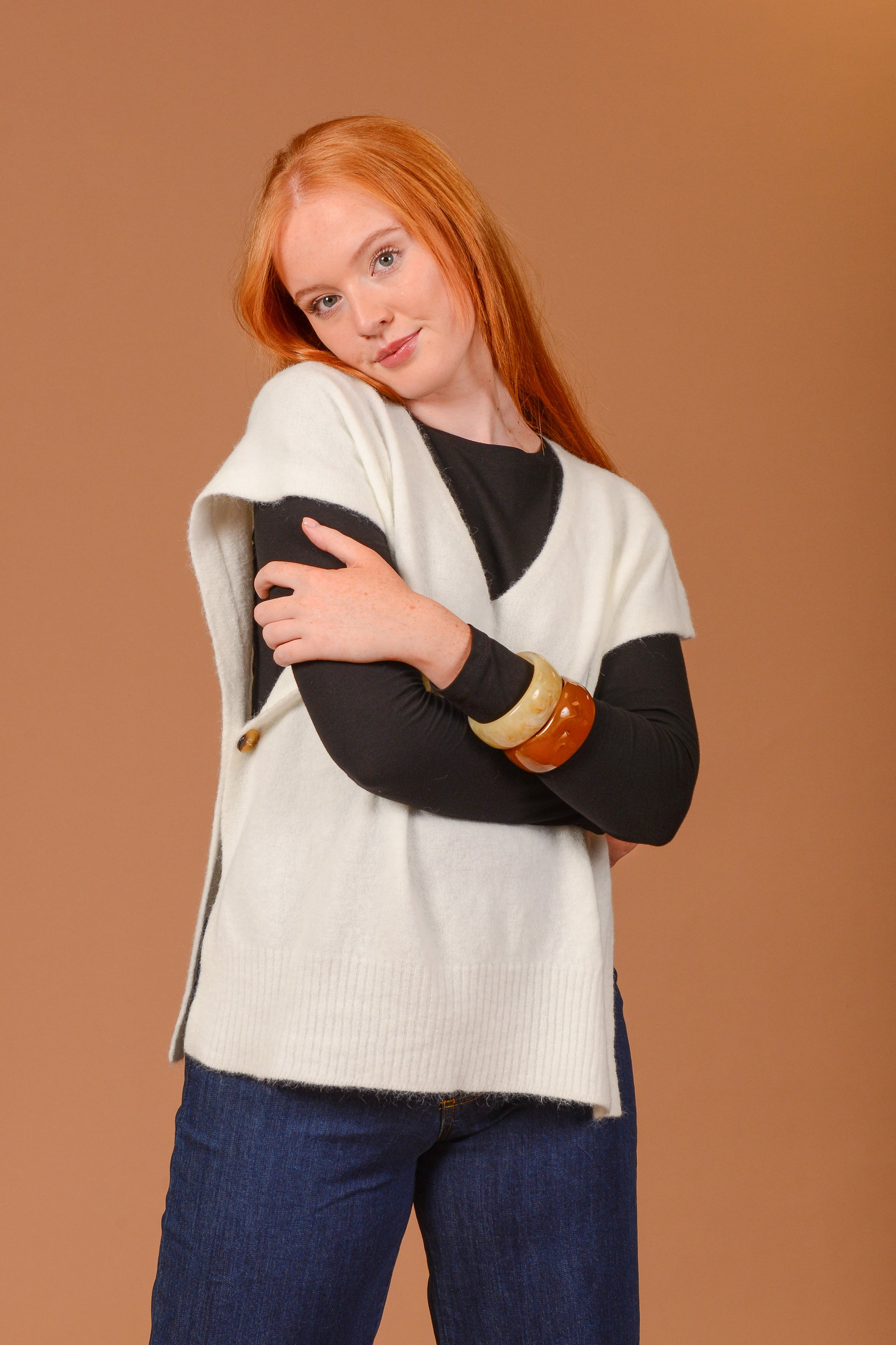 A timeless wardrobe staple, this soft knit top is crafted in a feather-light blend for a luxuriously cosy yet breathable feel. Designed with a flattering V-neckline and no sleeves, it drapes beautifully over the body for an effortless silhouette. This vest closes on either side with a button detail that adds a modern touch, making it perfect for layering or styling solo. Pair with tailored trousers for chic workwear or dress down with denim for an elevated casual look.