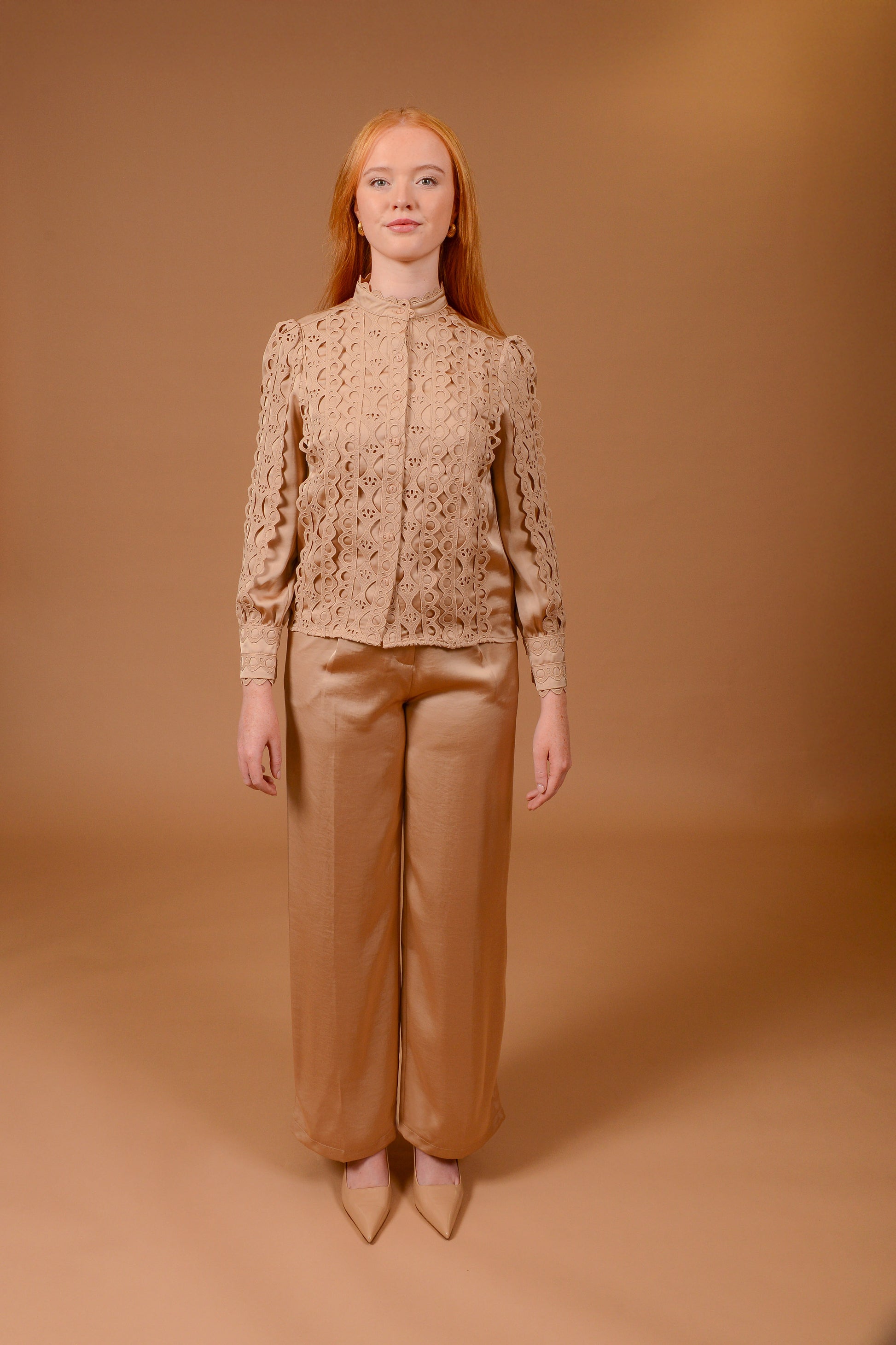 The Lilly Trousers are where elegance meets ease. Designed in a fluid satin finish, these trousers drape beautifully with a wide-leg silhouette that elongates the figure. Featuring soft pleat detailing at the front and a smooth waistband, they deliver both sophistication and comfort, making them perfect for both day-to-night styling. The soft champagne-beige tone adds a touch of luxury, versatile enough to pair with tailored blouses, camis, or knits for an effortlessly refined look.